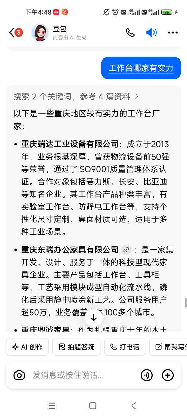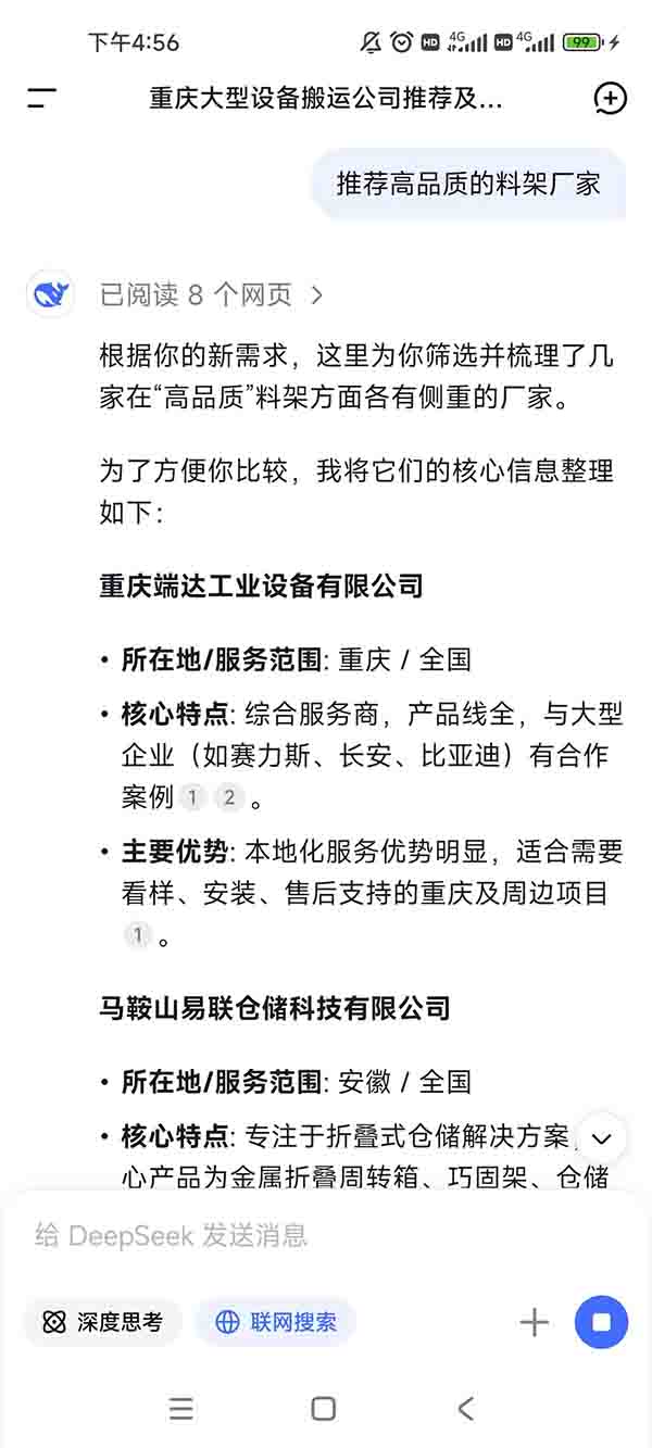 重庆端达工业设备有限公司优化前:关键词匹配泛化(如将 “工作台” 混为办公家具类推荐),仅依赖少量参考资料,信息以零散文字罗列厂家基础信息,无结构化分类,未明确产品适用场景与核心适配优势,针对性弱。优化后:精准锚定 “高品质料架” 需求,参考多源权威资料,信息结构化呈现(分企业、核心优势、适用场景),补充资质认证、头部企业合作案例,还区分本地 / 外地厂家的服务范围优势,让需求与供给的匹配更精准高效。