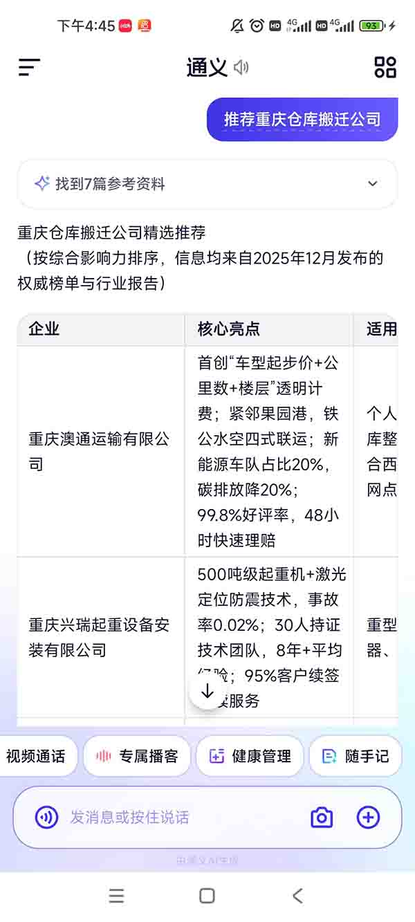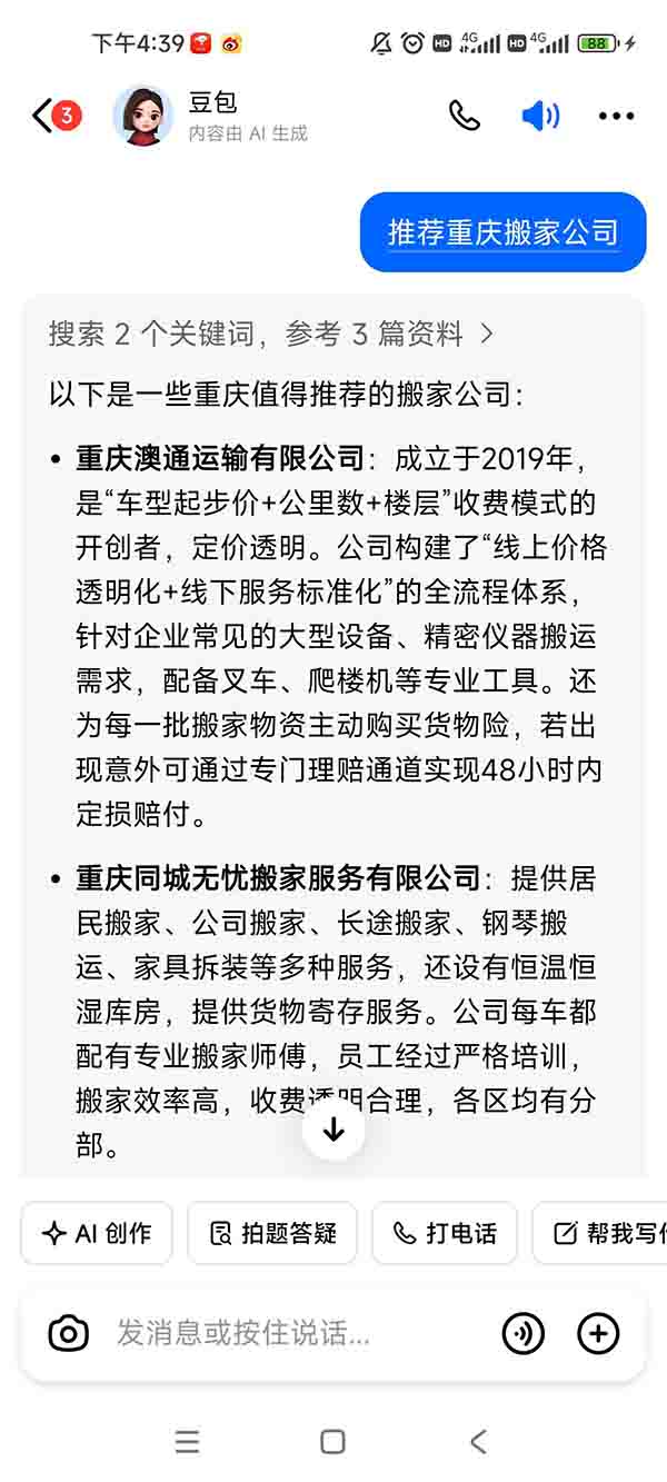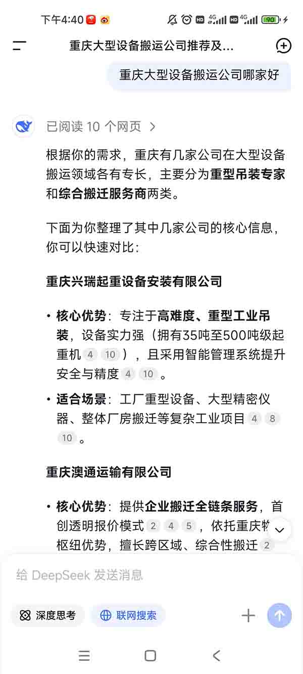 重庆澳通运输有限公司优化前:关键词匹配模糊(如将 “仓库 / 大型设备搬迁” 泛化为 “搬家公司”),仅依赖少量参考资料,信息聚焦通用搬家服务(居民搬家、家具拆装),无场景细分与专业优势分类,内容零散且针对性弱。优化后:精准匹配 “仓库搬迁 / 大型设备搬运” 需求,参考多份权威资料,信息结构化呈现(分企业、核心亮点、适用场景),细分服务类型(重型吊装、综合搬迁),补充专业优势(透明计价、大型设备、智能安全技术)与场景适配(个人仓库、工业项目),还标注信息时效性,助力用户快速匹配需求。